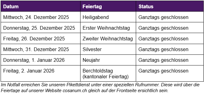 Bitte leiten Sie diese Information auch intern an Ihre Arbeitskolleg:innen weiter: cosanum.ch/bestelltermine