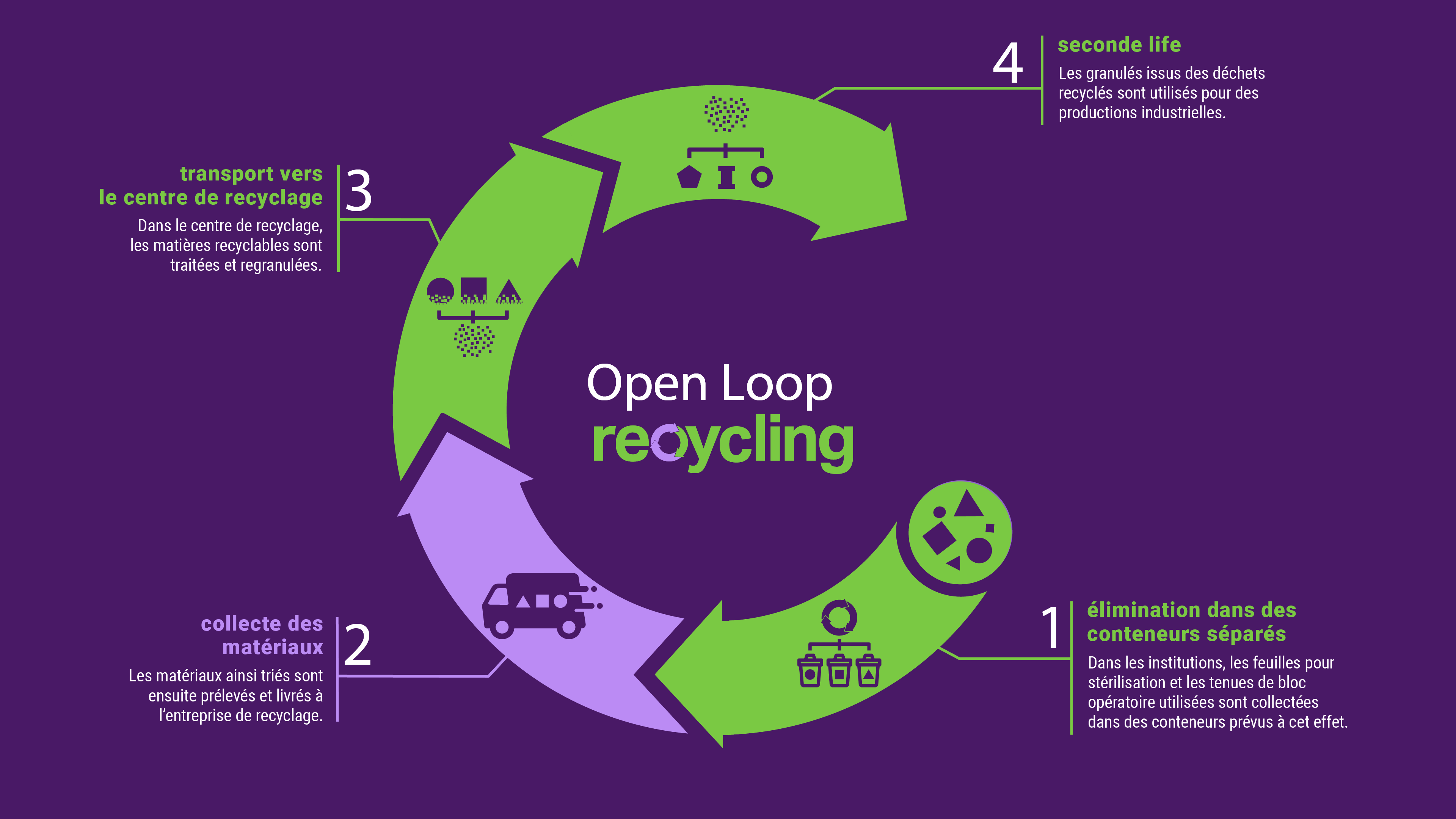 Les feuilles de stérilisation et les tenues du bloc opératoire sont recyclées de manière écologique − sans charge financière supplémentaire pour les institutions.